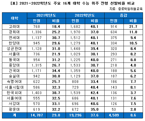 2020 상위권 대학 일반고 출신 입학생의 비율 연세대47.3%(1912명/4042명)'최저' 고려대57.3%(2522명/4405명)가 일반고생 가장 많이 선발.. 한양대54.5%(1934명/3548명) 성균관대53.9%(2204명/4087명) 서강대51.6%(963명/1866명) 서울대49.9%(1698명/3406명)
